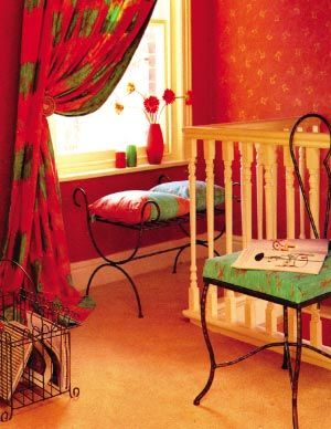 比如,一面白色的墻壁,可以作為以紅褐色與藍色為主色的現(xiàn)代繪畫的背景,相鄰的墻,飾以濃重的中國紅,與房間內的藍色沙發(fā)形成鮮明的對比。一盞帶有土色燈罩的大燈在紅色的墻壁上勾勒出圓錐形的色塊。