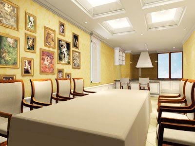 長(zhǎng)寬比例是餐廳的一大挑戰(zhàn),把衛(wèi)生間縮小30公分,占用部分廚房面積增加出一個(gè)保姆的空間。頂部?jī)擅孜甯叩牧旱资沟玫蹴敍](méi)有太多可變的余地,三個(gè)窗占用了所有可以利用的廚房吊柜空間,通過(guò)滿墻的裝飾畫(huà)來(lái)烘托進(jìn)餐的氛圍。