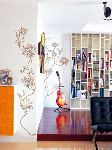 簡(jiǎn)約風(fēng)格的家中,往往蘊(yùn)涵著一語(yǔ)道破的 驚喜,如同一個(gè)不顯山露水的人,卻可能擁有耐人尋味的人格魅力。二者另一個(gè)共同點(diǎn)在于,都需 要我們?nèi)グl(fā)現(xiàn)和探尋。進(jìn)門正對(duì)著的墻壁,是給來(lái)者第一眼的印象,起初不敢畫,因?yàn)檫@個(gè)位置太 重要,太顯眼。丙烯、金漆,出來(lái)后的效果令人滿意,于是它們繼續(xù)'攀爬' 到客廳的墻面上。
