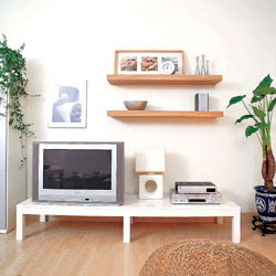 沒有用電視柜來放電視機,而是用了簡單的白色矮幾。整面墻也強調一種不規(guī)則的對稱。左下方的電視機和右上方兩塊隔板對稱,然后左上方加張畫來平衡畫面。