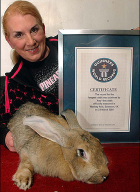 這只名叫艾米的巨型兔長1.2米,體重20公斤,每天要吃掉兩個蘋果、半個卷心菜、一把胡蘿卜,以及大量新鮮青草和混合飼料,2008年它被吉尼斯世界紀錄評為全球體積最大的兔子。據(jù)艾米的主人、現(xiàn)年56歲的英國婦女安妮特·愛德華茲介紹,她前不久帶著艾米從英國飛往意大利參加一檔紀錄片節(jié)目的拍攝。但在拍攝完成當(dāng)晚,艾米就在旅館里告別了人世。