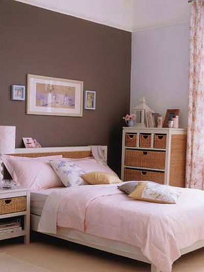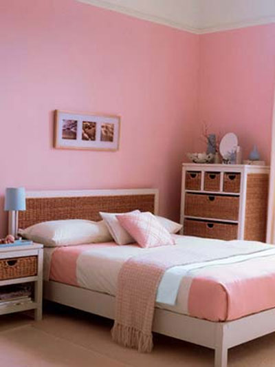 粉紅色的墻面定下整體基調(diào),給人以朦朧的浪漫感覺?;野咨蛎靥海约鞍咨昂熍c粉紅色過度十分自然。白色的床邊小桌和柜子仍然帶藤制抽屜,桌上放有藍(lán)色托盤和藍(lán)色臺燈,是整體色調(diào)中活潑的一筆,柜子上飾以小圓鏡、藍(lán)色花瓶和小花枝。灰白色的床上覆以粉紅色的床罩,白色床單、白色枕頭、藍(lán)、粉色小靠墊,溫暖而舒適。