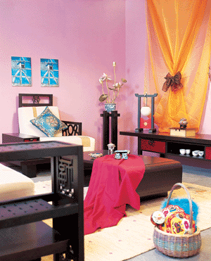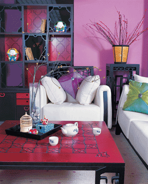 時尚的粉紫色墻面,配以新中式古典家具,是當(dāng)前最搶眼的流行趨勢