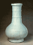 南宋 官窯粉青釉弦紋瓶 哥窯 宋代五大名窯之一,在浙江龍泉。燒制的青瓷有各式碗、盤、瓶、爐等,造型幽雅有古韻,典型器物有琮式瓶、貫耳瓶、鬲式爐、蓮瓣碗等。有的器物有刻劃、堆塑等裝飾,哥窯瓷采用多次施釉的工藝,使青釉濃厚青翠,色彩幽深,創(chuàng)出了粉青、梅子青等絕頂釉色,把青瓷的美,推到了一個(gè)新的境界。哥窯青瓷釉上有細(xì)碎的開片,稱作“百圾碎”,更小的叫“魚子紋”,把原本是缺陷的開片變成瓷器表面自然天成的裝飾,說明工匠們已經(jīng)掌握了開片的規(guī)律,可以人為地加以控制和利用,這只有在制瓷工藝達(dá)到高峰的宋代才能做到。