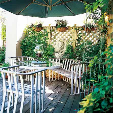 這個庭院的主空間是4.8×4.8米的露臺,搭建在車庫的頂上,與住宅的起居室、廚房相連接。螺旋形的樓梯,將它與4.8×7.6米的下沉花園相連接,從那里可以方便地進出書房。而最上層的陽臺正好利用了下面露臺的頂棚,與臥室相連,形成了私密的休閑空間。