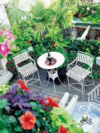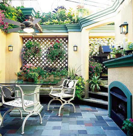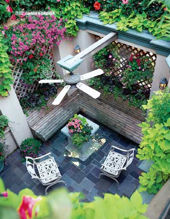 即使在沉悶的天氣里,下沉花園上方懸臂上的吊扇,也會給在花園里乘涼的人帶來習習清風。到了寒冷的季節(jié),就是漂亮壁爐發(fā)揮作用的時候了,暖暖的火光能驅(qū)走寒冷,增加戶外空間的使用時間?;▓@中種滿熱帶氣息的植物,如棕櫚樹、芙蓉花、黑葉芋與一年生植物、蔓生植物填滿了花箱和花盆,給小庭院帶來生機勃勃的感覺,也達到了阻隔外界視線、保護隱私的作用。而小噴泉潺潺的流水聲則把街道的喧囂淹沒在外。