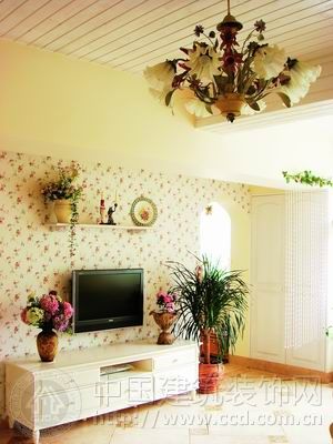 客廳的設(shè)計(jì)可謂千瘡百孔,主墻上居然有一根下水管和一根柱子!羽兒的做法很簡單:不能挪,那就只有遮起來。她用一款餐邊柜的波浪裝飾條的模板做了一道假墻來遮擋,前面用寬大的玫瑰花紋沙發(fā)一擋,視覺效果居然很不錯。