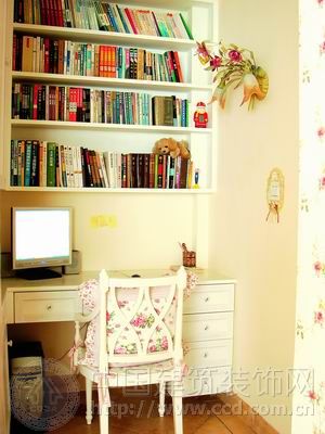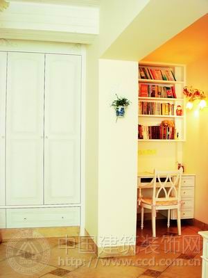 裝修后的立柱成了劃分客廳和書房區(qū)域的分界線,依立柱劃分左右兩個區(qū),左側(cè)是定做的長排大衣柜,柱子右側(cè)一個多平米的地盤則變成了“書房”。麻雀雖小五臟俱全,電腦桌、書架、吊柜全都有,甚至再擺放一臺掃描儀也沒問題。當(dāng)然了,家具尺寸都是依照電器尺寸量身定做的,不然哪里能活生生偷出1平米的空間呢?