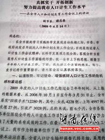 據(jù)悉,網(wǎng)上流傳的講稿圖片,系耒陽(yáng)市副市長(zhǎng)4月14日在該市人口與計(jì)劃生育工作會(huì)議上的講話,此后不久就有人發(fā)至網(wǎng)上各大論壇。
