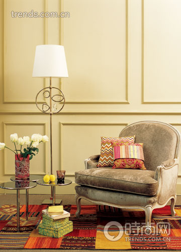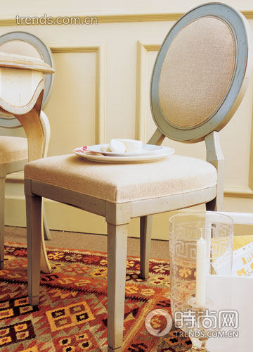 圖案多變的中東地區(qū)的手工地毯,更襯托出椅子的線條簡潔利索,一旁穩(wěn)穩(wěn)站立的大型擋風(fēng)燭臺很有古香古色的味道。