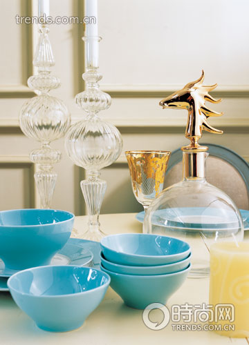 餐桌的線條帶著鮮明的復(fù)古風(fēng)潮,在背景墻的襯托下有種歲月沉淀的優(yōu)雅韻味?;野椎闹魃{(diào)也給餐桌布置上留下更多揮霍色彩的空間。天空一般純凈的藍(lán)色餐具,嬌嫩的花朵搭配細(xì)頸寬口花瓶,華貴的金色酒杯以及晶瑩剔透的燭臺,讓古典餐桌霎時渲染上現(xiàn)代式的優(yōu)雅。顏色純美干凈的餐具會讓人有種想品嘗美食的沖動,為了營造更加純凈的氛圍,燭臺、酒杯與酒瓶都選擇無色透明的玻璃材質(zhì),而一點金色的點綴更增添了一份高貴氣質(zhì)。