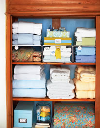 一個(gè)置物架就可把毛巾、床單等家紡用品盡收“腹”內(nèi)。首先要把毛巾類和床單、被罩類分開存放。毛巾可以按顏色分摞疊好,床單則可以按尺寸疊成方塊,將枕套縱向疊成條狀圍在床單上,再根據(jù)不同的使用季節(jié)打上標(biāo)簽區(qū)分。