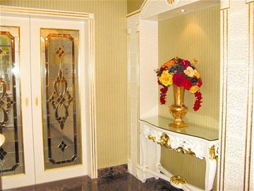 這是一個(gè)現(xiàn)代風(fēng)格的家,處處都流露出與眾不同的精致,而設(shè)計(jì)師只是在最適宜的地方恰到好處地運(yùn)用了一些新穎的裝飾材料及工藝,從而讓整套居室頃刻間靈活、生動(dòng)起來。但是最絕的莫過于客廳的背景墻了,這里也是本套別墅設(shè)計(jì)中的最大亮點(diǎn)。客人從進(jìn)入別墅的剎那間,最能感受的就是這里別樣的風(fēng)景了。原來,客廳背景墻采用了進(jìn)口品牌的裂紋漆等特殊工藝,形成了色調(diào)的對(duì)比和凹凸有致的立體效果。在此,雕花與描金工藝的適當(dāng)運(yùn)用,增添了金粉飾家的味道,華貴之氣立顯。除此之外,設(shè)計(jì)師還很好地運(yùn)用了歐式風(fēng)格的一些裝飾元素,再配以為之量身定造的新古典裂紋沙發(fā),以及與之相匹配的地毯、窗簾等,整體效果渾然天成。