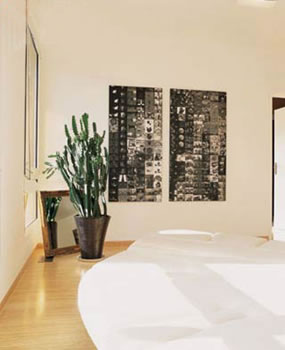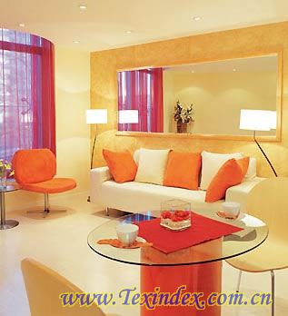 如果房間墻壁上有一塊大鏡子,鏡子里就可以反映出全屋的景象,似乎有一種房屋擴(kuò)大了的感覺(jué),其實(shí)是這種光學(xué)幻覺(jué)在起作用。鏡子可使你感覺(jué)到房間多了一扇窗似的,并能獲得另一個(gè)光源。白色沙發(fā)、橙色椅子和靠墊、同色的墻與地面,在光與影、虛與實(shí)中回旋,安靜、高貴卻時(shí)刻閃現(xiàn)著青春的色彩。