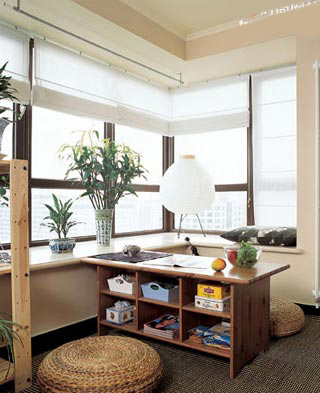 由于面積小,又處在鬧市,所以姜愫選擇了頂層,因?yàn)檫@里的層高能讓小屋子顯得大一些,而且也能杜絕窗外的喧鬧。從東、北兩邊寬大的飄窗看出去,真是能感覺(jué)到在浮華絢麗都市背景下能擁有如此安詳?shù)男∥輰?shí)在是一種幸運(yùn),而且作為年輕人是不可能逃避紛繁的現(xiàn)實(shí),但有時(shí)可以選擇遠(yuǎn)觀,而不離去。