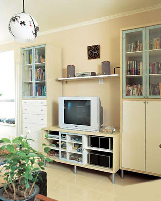 一個(gè)人住很少自己在家做飯,盡管姜愫有著一手的好廚藝,但看來(lái)是一般朋友所享受不到的。因而她將原來(lái)的封閉式廚房改成了開(kāi)放式,使得客廳的空間得到了擴(kuò)展。其實(shí)對(duì)于一個(gè)人來(lái)說(shuō),客廳的利用率要遠(yuǎn)遠(yuǎn)超過(guò)對(duì)廚房、衛(wèi)生間、臥室的使用,獨(dú)處時(shí)或和朋友相聚,這里總是首選。除此之外,姜愫還把客廳做了很好的劃分,一個(gè)是視聽(tīng)區(qū)域,一個(gè)則是會(huì)客區(qū)域。會(huì)客區(qū)是和廚房緊密相連,這樣拿取飲料或者想隨便做點(diǎn)什么,朋友和自己都會(huì)很隨意,為了讓空間顯得盡可能的寬敞些,而不至于讓朋友們覺(jué)得擁擠,姜愫沒(méi)有選擇常規(guī)的桌椅沙發(fā),而是采取了日式的風(fēng)格,一塊地毯劃分了這塊區(qū)域,上面是矮矮的蒲團(tuán)和矮矮的桌子,親密的朋友團(tuán)坐在上面很愜意,緊靠著的飄窗也讓這里的視野很開(kāi)闊。而視聽(tīng)區(qū)域通常是自己獨(dú)自享受的,平時(shí)想一個(gè)人的時(shí)候,靜靜地背靠在心儀的沙發(fā)上,看張碟片或者聽(tīng)聽(tīng)音樂(lè),都是美妙至極的。