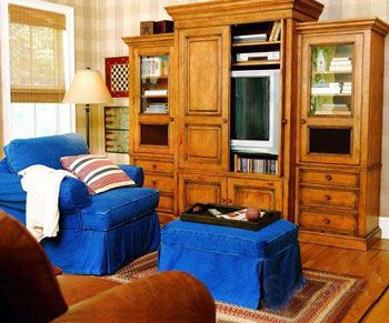 嵌入式的電視柜能讓客廳的儲物空間增大,周圍的柜子可以放書、DVD等物品。