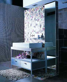 如果你的墻面底色較深就運用博洛尼最大膽的POP花色瓷磚作為主題墻裝飾墻面吧。讓報紙堆砌出的亮麗色彩大面積裝飾,拼貼的效果會使浴室設(shè)計看起來更加大氣,配上熠熠生輝拉絲鋁浴室家具和亮面鏡子絕對拉風(fēng)。張揚的創(chuàng)意是時尚年輕人不二的選擇。