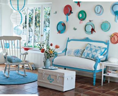可以在墻上安裝擱板用來放置書刊,用籃子來裝各種混在一塊的小圓片和小物件,還可以安裝掛鉤用于平常掛衣服,甚至可以在屋里設(shè)置一掛秋千,或者是一個吊床、一把搖椅。