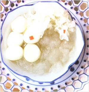 [做法]白鯽魚宰洗凈,慢火煎至微黃,濺入少許清水,鏟起;雞蛋煎為荷包蛋狀,鏟起;起油鑊爆香姜片,加入清水1250毫升(5碗量),武火滾沸,下白鯽魚滾片刻,下荷包蛋,滾沸后撒入適量食鹽、胡椒粉便可。