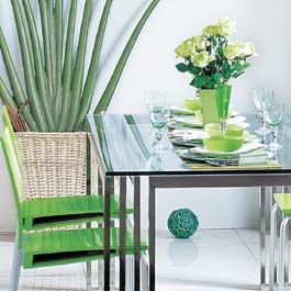 墻邊茂盛的綠色植物讓房間充滿了熱帶氣息,而餐邊柜飽滿的紅色與黑色也加強(qiáng)了這一感覺,配合淡綠色的餐椅和餐具,房間有著濃烈的熱帶風(fēng)情,適合喜愛田園風(fēng)情的人。