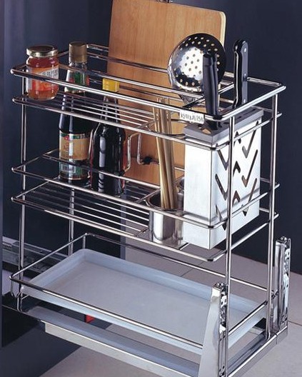 小型調(diào)料柜往往有不夠用的感覺(jué),足足有一扇門板大小的調(diào)料拉籃容量驚人,連砧板都能放進(jìn)去,置于爐臺(tái)側(cè)邊,成瓶的調(diào)料可以斜放,取用更方便快捷。