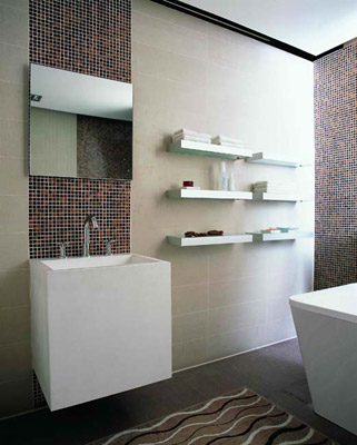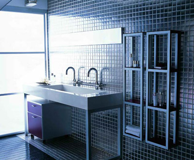 在沙丘中看到水流和金屬元素一定倍感清涼,博洛尼設計師利用人們對沙丘表現出灼熱和干燥的思維定式和代表清涼的元素進行對比后產生的效果會使涼爽的感覺無限加倍。塑造清涼衛(wèi)浴空間利用對比的方法簡單易行。