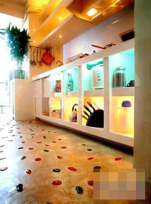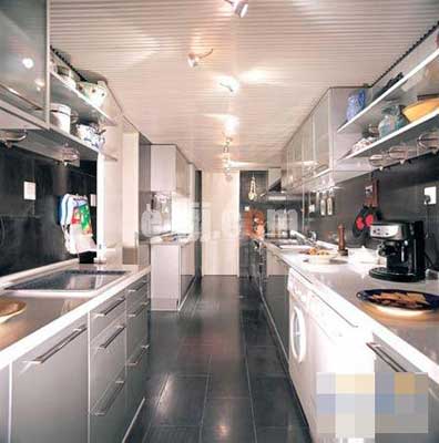原本極為普通的水泥地面,因?yàn)榍渡狭擞昊ㄊ悴噬袡C(jī)玻璃塊,立即變得活靈活現(xiàn),讓人見之不禁想擺脫鞋襪的束縛,光著腳丫在上面重溫一下海邊嬉戲的快樂。重新筑建的取代整體櫥柜地位的水泥墻體也毫不遜色,開放式的格局設(shè)計(jì),冷熱光源的區(qū)分,讓存儲(chǔ)柜亦是展示柜,廚房小家電及器具既得到了安身立命之所,又成為狹小空間的裝飾點(diǎn)綴。與其它風(fēng)格相比,“一”字型和“L”型簡(jiǎn)約風(fēng)格的整體櫥柜更加適合這種封閉式的廚房空間。以直線條為主的整體櫥柜,因磨砂玻璃的加盟,有效地實(shí)現(xiàn)了期盼已久的瘦身,從視覺上為廚房減少了一些擁擠感,并為不甘寂寞的早餐桌騰出一席之地;絢麗的櫥柜飾面,不但可以激起人的食欲,在縱橫馳騁于白色瓷磚間的同色調(diào)的勾線和窗簾的配合下,徹底消除了沉悶的封閉氣氛。