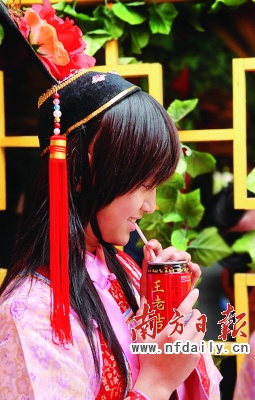 清朝時,王老吉在廣東很暢銷。圖為穿古典服飾的女孩喝王老吉。 資料圖片