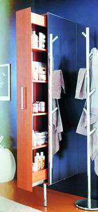 衛(wèi)生間需要一些隔斷來進(jìn)行干濕分區(qū),那么這種像一堵墻似的豎柜就派上用場了,兩面貼上鏡子,可以進(jìn)行全身的裝束修正。拉開側(cè)面的把手,不得了,無論是大瓶的保濕水、精油,還是大袋的浴鹽、化妝棉,都整齊地碼放在后面的擱架上。注意安裝這種柜子不光要考慮本身的大小,還要預(yù)留出拉開后的體積。不建議面積小的衛(wèi)生間安裝。