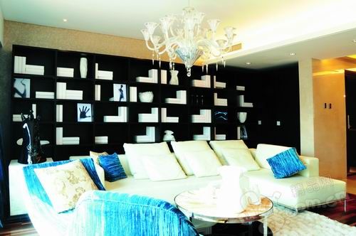 5.客廳的超大書柜成為了最好看的背景,把書按照這種形式擺放只是為了達到一種裝飾效果,和點綴在書柜上的那些相框異曲同工。白色的沙發(fā)、白色的地毯顯得有些單調,但有了旁邊的藍色絲絨貴妃榻,那就是一番別樣的雅致了。這樣設計也使花花的地板不顯得突出了。