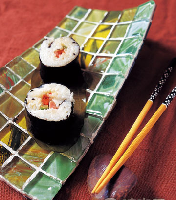 看慣了家里的平盤,這款自由扭轉的壽司盤是否給了你一點點驚喜?新型的玻璃馬賽克本身就有裝飾的花紋圖案,有點寫意,很適合做壽司盤,強化了它濃濃的東方味道。不過,由于它不是平的,制做起來就多了道工序,兩層馬賽克之間就需要夾進一層薄的鐵板或者鐵網(wǎng),以固定它的造型。