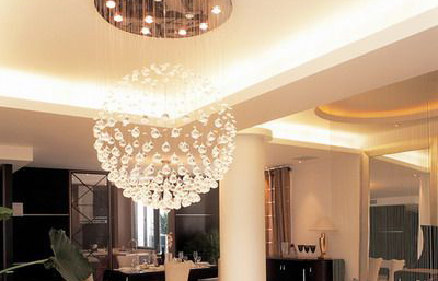 客廳是待人接客的場(chǎng)所,要求營(yíng)造一種溫暖熱烈的氛圍,因此客廳以選用莊重、明亮的吊燈或吸頂燈為宜。如果房間較高,宜用白熾吊燈或一個(gè)較大的圓形吊燈,這樣可使客廳顯得通透,但不宜用全部向下配光的吊燈,而應(yīng)使上部空間也有一定的亮度,以縮小上下空間亮度差別。燈具的造型與色彩應(yīng)與客廳的家具擺設(shè)相協(xié)調(diào)。