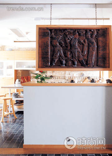概要: 懸吊在廚房開(kāi)放式窗口重鑲了邊框的“劉、關(guān)、張”木雕,是客人入門(mén)后的第一個(gè)驚喜看點(diǎn)。 李慧的家,正應(yīng)了歐陽(yáng)應(yīng)霽所說(shuō)的“樸拙方法論”。空間內(nèi),天然的、磨損的、質(zhì)樸的、剝落的、那些帶了些微銹色的零星片段,接續(xù)在一起,讓人感覺(jué)到這個(gè)家輕重有節(jié),渾然天成?! “霃轿骞铩 拔壹液芏嘌b修材料都是在周邊五公里之內(nèi)選擇的?!边@是李慧有關(guān)這個(gè)家開(kāi)門(mén)見(jiàn)山說(shuō)的第一句話。