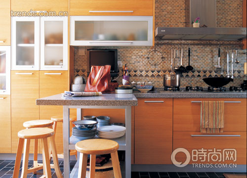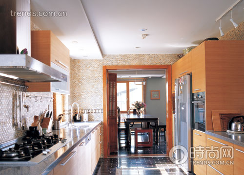 廚房墻地面的石材在普通的建材城都可以找到,出眾的效果全在于新穎拼貼的方式。