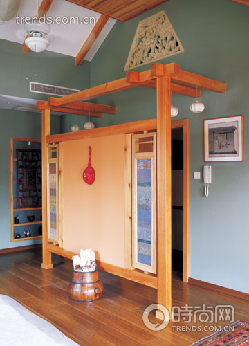 閣樓的改造提供給李慧一個(gè)極其實(shí)用的大衣帽間,但主臥大門(mén)的位置也因此改變,床的位置回避不了面對(duì)大門(mén)的局面,因此,李慧設(shè)計(jì)了一面類似于中式建筑中的“影壁”的松木隔擋,不僅解決了實(shí)際問(wèn)題,同時(shí)還具有了中式建筑所講求的迂回含蓄的韻味。