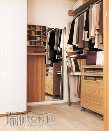 打造更衣室前,要先對其功能做個預想,并考慮好衣服的分類方法。不足5平米的小儲藏室如要做成步入式更衣室,建議選用“L”形的衣柜;而狹長的儲藏室則適用“一”字形的衣柜。