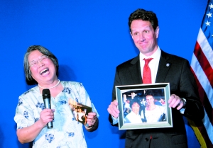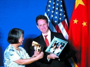 北京大學(xué)中文老師傅民(左)向美國(guó)財(cái)長(zhǎng)蓋特納贈(zèng)送28年前的合影照時(shí),蓋特納表示驚喜。昨日,蓋特納在北京大學(xué)發(fā)表演講時(shí),用中文呼吁中美“同心協(xié)力”應(yīng)對(duì)挑戰(zhàn)。蓋特納1981年曾在北大學(xué)中文,傅民是其當(dāng)年的老師。王天天 攝