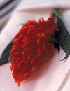 “過去在酒吧特別流行用試管連喝9杯,選擇擺花的時候,我一下子就想起那個紅色透明的盛器,上面共有9個試管正好可以用來插花,而火紅色向上的火焰花造型就是絕配。顏色上互相呼應(yīng),造型也相互依托,用它來做餐桌擺花,馬上把餐桌的歡樂氣氛帶了出來。