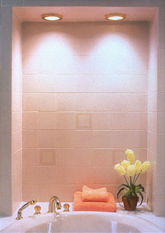 第一部分包括淋浴空間和浴盆、座廁等空間。是以柔和的光線為主。照度要求不高,要求光線均勻。光源本身還要有防水功能、散熱功能和不易積水的結構。一般光源設計在天花和墻壁。其實很多情況下浴室吸頂的風機中的光線較暗,比理想照度要差,浴霸由于是強光發(fā)熱光線太強都不適合浴室照明。應當有專門的照明光源來解決問題。一般在5平方的空間里要用相當于60W當量的光源進行照明。而對光線的顯色指數要求不高,白熾燈、熒光燈、氣體燈都可以。相對來講我比較主張墻面光,這樣可以減少頂光源帶來的陰影效應。光源最好離凈身處近些,只要水源碰不到就可以。