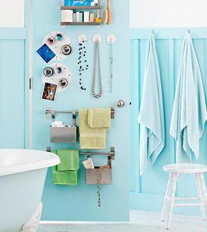 毛巾、手紙、電吹風(fēng)……統(tǒng)統(tǒng)請(qǐng)上墻去。幾塊簡單的玻璃板懸于壁上,用來擺放化妝品。