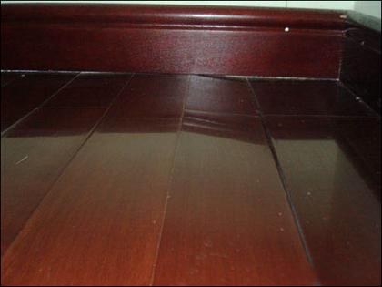 去年8月的一天,他突然發(fā)現(xiàn)地板多處開裂、爆漆,已全部嚴(yán)重變形。他立即通知了代理公司和商場。