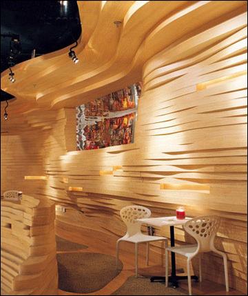 SongClub是一個(gè)為音樂而生的空間,作為音樂餐吧,Song兼具了多重功能,是餐廳又是酒吧,可以舉辦演出,同時(shí)還**唱片。為解決多功能同置一室的沖突,仲松特意為這410平米的空間設(shè)置了大量延綿不斷的木質(zhì)曲線,笑稱其為“室內(nèi)的山地景觀”,這些曲線將可能的沖突聯(lián)系起來,并融為一體。在這里,木質(zhì)的曲線并非單純裝飾所用,它更是空間與空間之間的隔斷,是高低錯(cuò)落的座椅,是空間中流淌的韻律……你可以隨意自由地穿梭,也可以與人保持著安全距離。