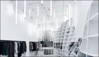 “生長”是仲松為這個(gè)空間里的實(shí)用曲線設(shè)計(jì)定義的概念,并非在強(qiáng)調(diào)空間物理可變形,而是在不同時(shí)段與氛圍下,讓空間能夠給環(huán)境體驗(yàn)者提供豐富的感官可能性,并強(qiáng)調(diào)了使用者與設(shè)計(jì)間的互動(dòng)關(guān)系。設(shè)計(jì)師在理念上將Waterstone設(shè)計(jì)為一種裝置,曲線帶給空間的連貫性促成了這種交流的發(fā)生,空間相位的多樣性增添了這種交流的趣味性,在這里,設(shè)計(jì)表達(dá)并非單純出于對視覺的滿足,更是一種人體感官上的全方位體驗(yàn)——無論是像太空艙一樣的獨(dú)立更衣區(qū)域,還是斷點(diǎn)連續(xù)的陳列區(qū),或者是角落充分利用空間的曲線格架,都是為了強(qiáng)調(diào)一種全面感受而生。