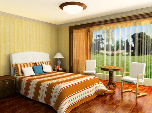 臥室色彩一般以家具、墻面、地面的色彩為主調(diào)。比如,墻是以綠色系列為主調(diào),房間的布藝織物就不宜選擇太多的暖色調(diào)了。