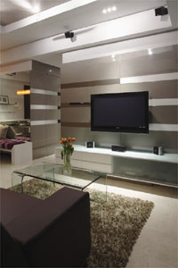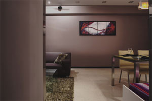 設(shè)計(jì)師為公寓客廳選擇線條簡潔的紫褐色沙發(fā),透明的玻璃茶幾。飯廳里特別定做的長凳子,配搭上艷麗的紫紅色坐墊,叫飯廳亮麗起來。