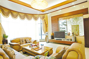 從花園走入到客廳,眼前則是另外一種感覺,真皮的沙發(fā),在燈光的照射下,彰顯出一種豪華的光環(huán)。若大的落地窗更是讓對面的黃旗山一覽眼前。設(shè)計師表示,設(shè)計的風格與軟裝的配置很重要,因為韓先生的客廳比較大,所以所擺設(shè)的家具就要對稱,這樣更顯得大氣。