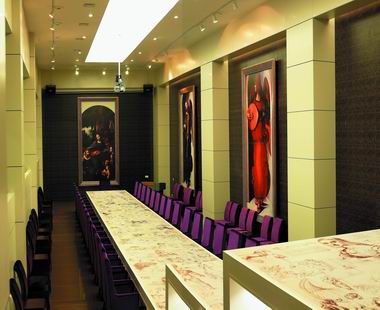 藝術(shù)館同時也是蒙娜麗莎這一中國陶瓷建材領(lǐng)軍品牌重要的文化營銷陣地。因此,除了作為建筑裝飾材料被廣泛運用之外,陶瓷在這里還成為了藝術(shù)和文化的載體。繪制于輕薄的瓷板之上的達•芬奇和其他文藝復(fù)興時期藝術(shù)家知名畫作的復(fù)制品,以其鮮麗的光澤和細膩的色彩吸引了參觀者的注目;創(chuàng)造性使用了560幅達•芬奇素描稿的32米長巨型瓷板臺面也成了藝術(shù)館的“鎮(zhèn)館之寶”。