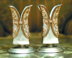 鐵藝燭臺(tái)做成對(duì)襟服裝樣式,浮雕花朵和黃銅色的邊線(xiàn)有種滄桑的感覺(jué)。