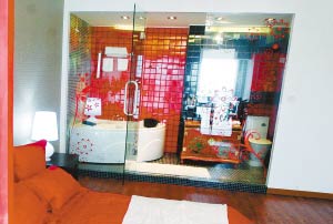 這個(gè)臥室(見圖一)是為一對(duì)新人設(shè)計(jì)的,在衛(wèi)生間的玻璃隔墻上,用了大紅色的印花圖案,簡(jiǎn)單的花朵線條使臥室和衛(wèi)生間兩個(gè)空間的氣質(zhì)十分接近,整個(gè)生活細(xì)節(jié)都由此體現(xiàn)。